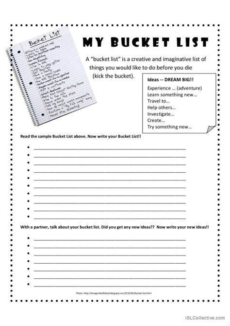 Web this worksheet asks children to write down their hopes for the future by creating a bucket list. English as a second language (esl) grade/level: Web a bucket list is a catalog of all the adventurous activities an individual wants to do before they “kick the bucket.” whether you have 10 or 100 things to do before you die, our free.